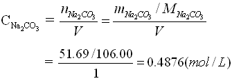 例: 1升Na2CO3溶液中含有溶質(zhì)Na2CO3 51.69g,求該溶液的濃度。(Na2CO3 106.00)