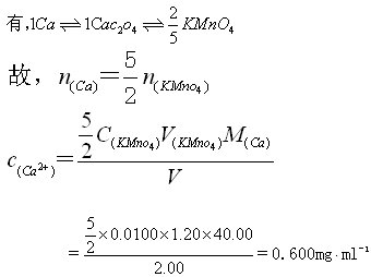例2:檢驗(yàn)?zāi)巢∪搜褐械暮}量,取2.00 ml血液,稀釋后用(NH4)2C2O4溶液處理,使Ca2+生成CaC2O4沉淀,沉淀過濾洗滌后溶解于強(qiáng)酸中,然后用c(KMnO4)=0.0100 mol/L的KMnO4溶液滴定,用去1.20 ml,試計算此血液中鈣的含量。M(Ca)=40.00g醫(yī).學(xué)教育網(wǎng)搜集整理.mol-1