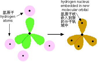 氫的電子位于1s軌域(以原子核為圓心的球狀空間區(qū)域。我們在這一區(qū)域內(nèi)找到電子的概率是固定的(比如說95%的概率))。當(dāng)共價鍵形成時, 原子軌域(單個原子中的軌域)相互融合并產(chǎn)生新的軌域,新的軌域被稱為分子軌域,分子軌域中包含著用來成鍵的電子對。