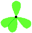 sp3 雜化軌域在形狀上類似半個p軌域,它們組織各自在空間中的方位并盡可能的使自己與其它3個sp3 軌域相距遙遠(yuǎn)。你可以以右圖原子核為中心構(gòu)造一個正四面體(金字塔形,4個面為等邊三角形),通過選擇恰當(dāng)?shù)倪呴L,4個sp3 軌域?qū)⒛軌蚍謩e接觸到正四面體的4個角。注意,為了使右圖的原子核清楚可見, 我們不得不將其所占的面積比例擴(kuò)大了許多倍。