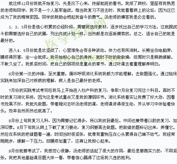 編者按:在醫(yī)學(xué)教育網(wǎng)“我的醫(yī)考之路”大型征文活動(dòng)中有很多的學(xué)員踴躍參與,其中執(zhí)業(yè)醫(yī)師學(xué)員根據(jù)自己2010年執(zhí)業(yè)醫(yī)師考試的經(jīng)驗(yàn),寫下了《我的醫(yī)考之路——臨床執(zhí)業(yè)醫(yī)師》一文,與廣大奮斗在2011年醫(yī)學(xué)考試第一線的朋友們分享!