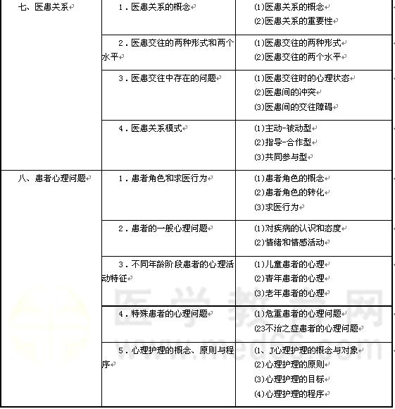 | 二、醫(yī)學(xué)心理學(xué)基礎(chǔ) | 1.心理學(xué)的概述 | (1)心理學(xué)的概念 (2)心理現(xiàn)象的分類 (3)心理實(shí)質(zhì)的內(nèi)容 |