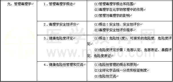 | 一、衛(wèi)生毒理學(xué)基本概念 | 1.毒理學(xué)、毒性和毒作用 | (1)毒理學(xué)、衛(wèi)生毒理學(xué) (2)概念:外源化學(xué)物、毒性、毒物、中毒 (3)毒理學(xué)研究方法 (4)損害作用與非損害作用 (5)毒作用分類 (6)選擇毒性和靶器官 (7)生物學(xué)標(biāo)志 |