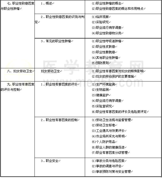 | 2.職業(yè)性有害因素與職業(yè)性損害 | (1)職業(yè)性有害因素的概念與分類 (2)職業(yè)病、工作有關(guān)疾病和職業(yè)特征 | |