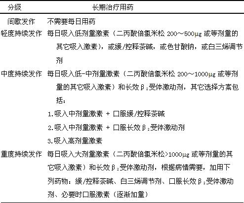 1.輕度:間斷吸入短效β2受體激動(dòng)劑,如沙丁胺醇或特布他林200~400μg/次;療效不佳時(shí)可加服β2受體激動(dòng)劑控釋片,或小量茶堿控釋片(200mg/d)。