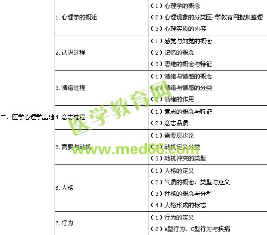 | 一、緒論 | 1.醫(yī)學(xué)心理學(xué)的概述 | (1)醫(yī)學(xué)心理學(xué)的概念與性質(zhì) (2)醫(yī)學(xué)心理學(xué)在現(xiàn)代醫(yī)學(xué)中的意義 |