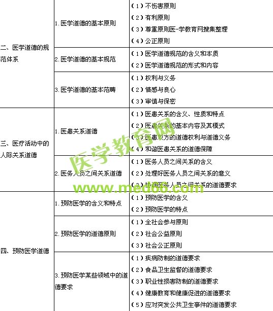 | 3.醫(yī)學(xué)倫理學(xué) | (1)醫(yī)學(xué)倫理學(xué)的概念 (2)醫(yī)學(xué)倫理學(xué)的歷史發(fā)展 (3)醫(yī)學(xué)倫理學(xué)的研究對象和內(nèi)容 (4)醫(yī)學(xué)倫理學(xué)與相關(guān)學(xué)科的關(guān)系 (5)學(xué)習(xí)醫(yī)學(xué)倫理學(xué)的意義和方法 |