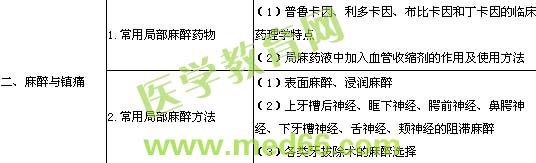 | 二、麻醉與鎮(zhèn)痛 | 3.局部麻醉的并發(fā)癥及其防治 | (1)暈厥 (2)中毒 (3)過(guò)敏反應(yīng) (4)感染 (5)血腫 (6)神經(jīng)損傷 (7)暫時(shí)性面癱 (8)暫時(shí)性牙關(guān)緊閉 |