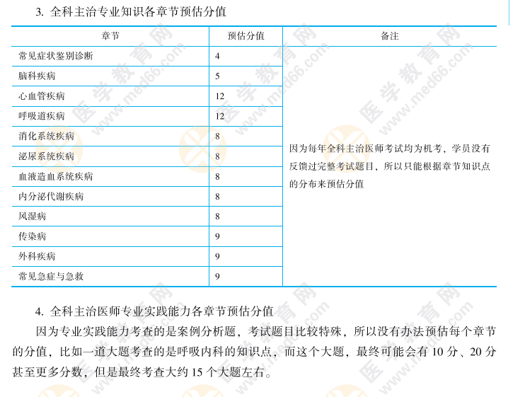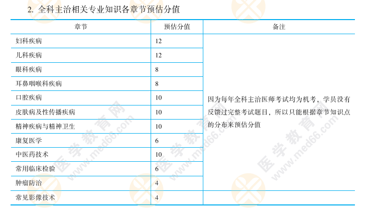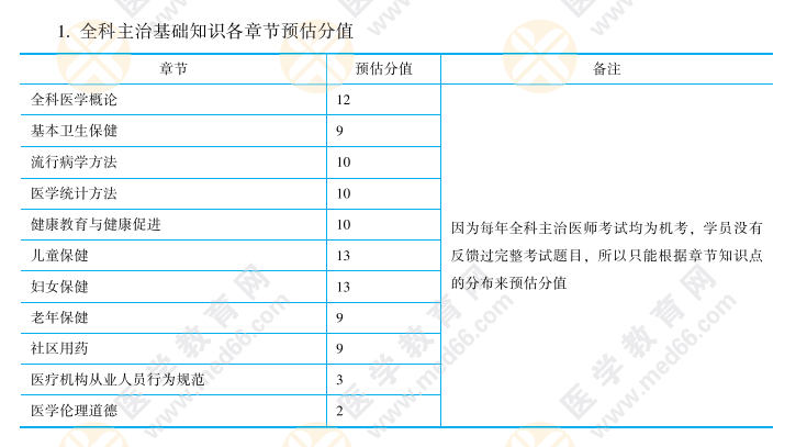 以上各章節(jié)分值占比是根據(jù)歷年考試得出的預估分值,各位全科主治考生可以參考復習,但是實際分值占比需以實際考試為準。