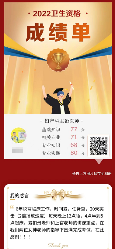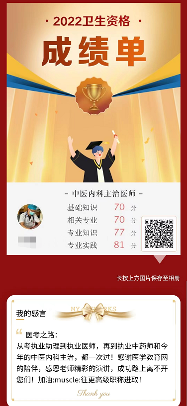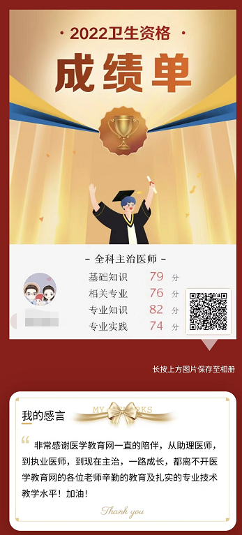 也非常感謝學(xué)員如此信任醫(yī)學(xué)教育網(wǎng),恭喜恭喜,順利通過全科主治醫(yī)師考試,努力復(fù)習(xí),好好聽網(wǎng)校老師的課程,一路成長,希望通過這位學(xué)員的分享可以讓大家更加信賴醫(yī)學(xué)教育網(wǎng)的老師,相信醫(yī)學(xué)教育網(wǎng)課程的品質(zhì)!