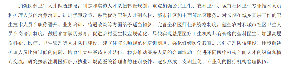 首先,讓我們來(lái)看一下近幾年國(guó)家對(duì)于醫(yī)藥衛(wèi)生體系改革的整體指導(dǎo)思路。2009年的《中共中央國(guó)務(wù)院關(guān)于深化醫(yī)藥衛(wèi)生體制改革的意見》中指出:要建立健全覆蓋城鄉(xiāng)居民的基本醫(yī)療衛(wèi)生制度,加強(qiáng)醫(yī)藥衛(wèi)生人才隊(duì)伍建設(shè)。