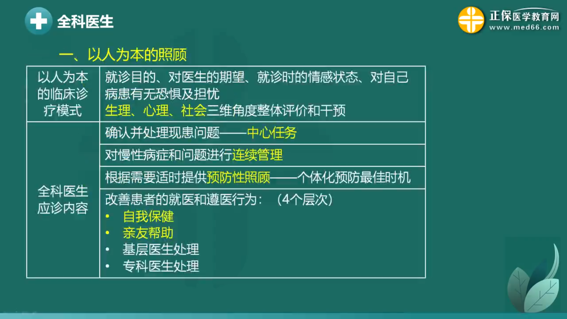 全科醫(yī)生的工作方式包括以人為本的照顧、以家庭為單位的照顧、以社區(qū)為基礎的照顧、以預防為導向的照顧、團隊合作,其中前三個為高頻考點,雖然內容較簡單,但需要大家抽出一點時間來了解。