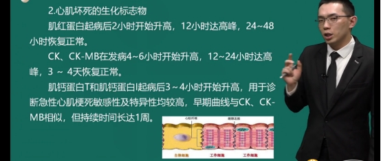 解答:急性心肌壞死時,由于心肌細胞損害導致肌紅蛋白(Mb)、肌鈣蛋白T和肌鈣蛋白1(TnT,TnI)、肌酸磷酸激酶(CK)及CK同工酶(CK-MB)從壞死組織釋放入血液循環(huán)而被檢出。肌紅蛋白起病后2小時開始升高,12小時達高峰,24~48小時恢復正常。CK,CK-MB在起病4~6小時開始升高,12?24小時達高峰,3?4天恢復正常。肌鈣蛋白T和肌鈣蛋白I起病后3~4小時開始升高,用于診斷急性心肌梗死敏感性及特異性均較高,早期曲線與CK、CK-MB相似,但持續(xù)時間長達1周。