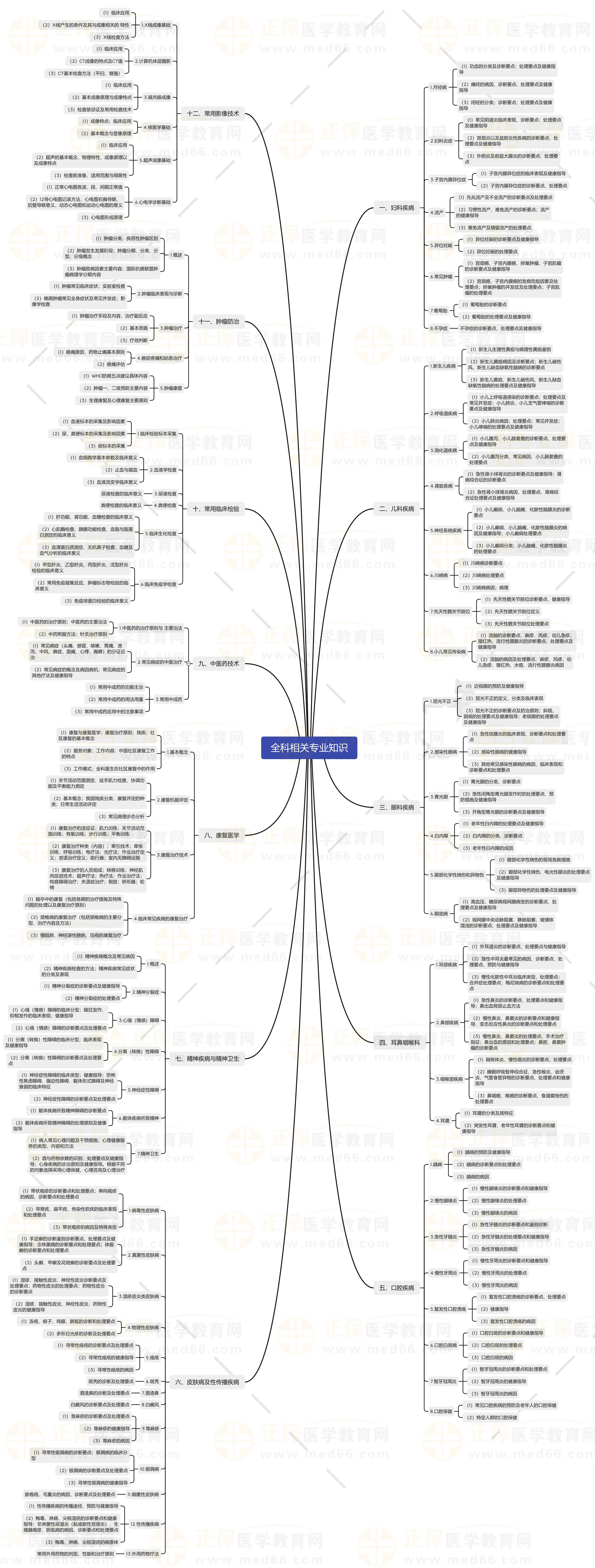 全科主治醫(yī)師考試實行全國統(tǒng)一組織、統(tǒng)一考試時間、統(tǒng)一考試大綱、統(tǒng)一考試命題、統(tǒng)一合格標準的考試制度,原則上每年進行一次。2024年全科主治醫(yī)師考試新考期已經(jīng)開始了,為了幫助各位考生理清考試知識點脈絡,更有針對性復習,醫(yī)學教育網(wǎng)為大家整理全科主治醫(yī)師《相關專業(yè)知識》知識點地圖如下: