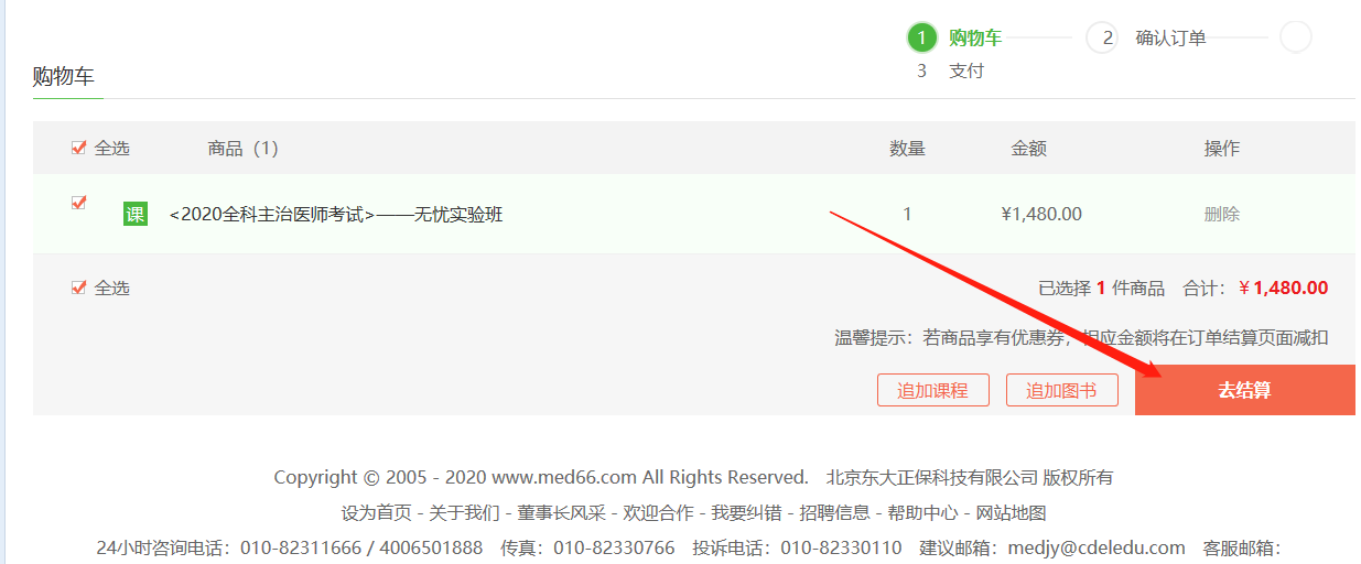 在購物車內(nèi)確認(rèn)已選課程,確認(rèn)無誤后點(diǎn)擊“去結(jié)算”;