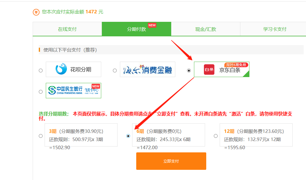 在支付頁面,選擇分期付款-京東白條進(jìn)行支付,分期期數(shù)一定要選擇6期哦!