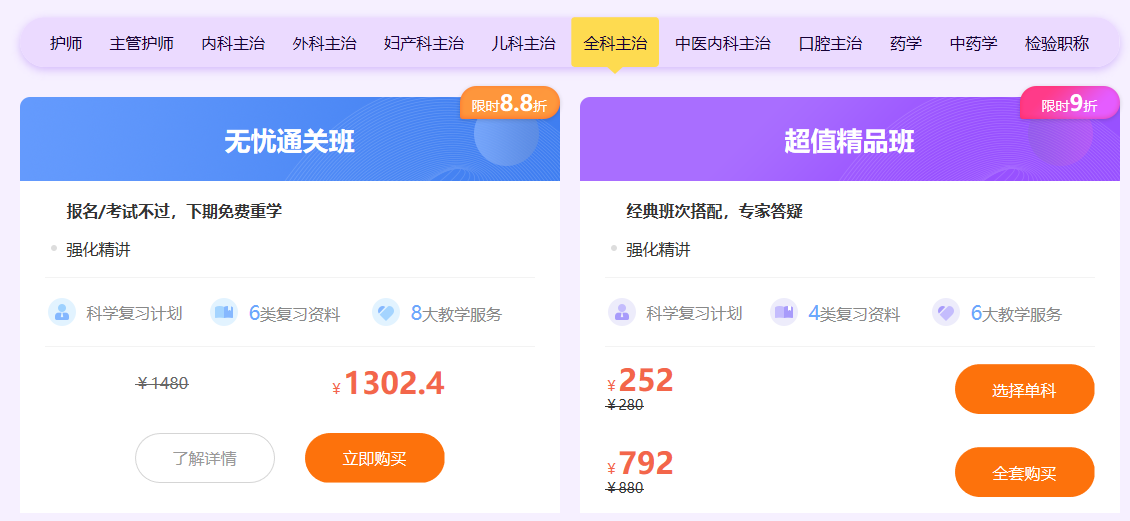 今年沒有參加全科主治醫(yī)師考試的各位考生們也不用覺得遺憾,網(wǎng)校為各位準(zhǔn)備了備考福利!全科主治醫(yī)師兩大班次,適用于不同情況的你,8.8折優(yōu)惠,還可以疊加優(yōu)惠券使用,醫(yī)學(xué)教育網(wǎng)在你備考路上伴你左右。