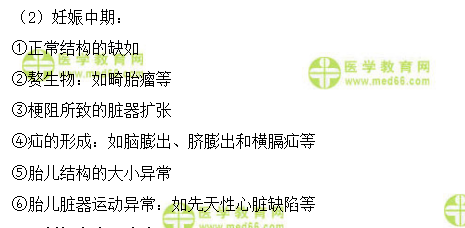 (1)妊娠早期:評估胎齡及胎兒的生長。妊娠早期陰道超聲檢查還可用于觀察胎兒肢芽、腹部、顱腦及心臟的結(jié)構(gòu)。
