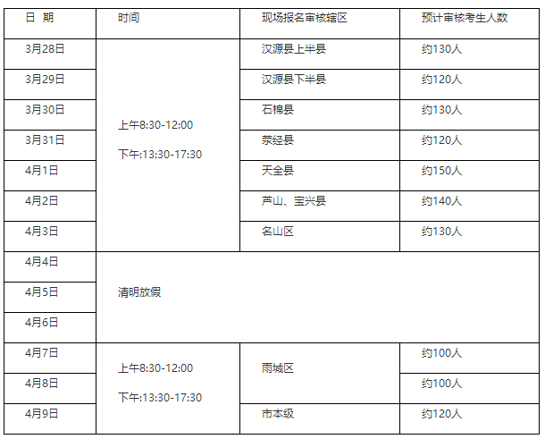 根據(jù)國家醫(yī)師資格考試相關(guān)工作安排,結(jié)合目前新冠肺炎疫情形勢,經(jīng)研究,雅安考點(diǎn)2020年醫(yī)師資格考試報(bào)名現(xiàn)場審核工作定于3月28日-4月9日進(jìn)行。為確保在做好新冠肺炎防控工作的同時(shí),高效、有序完成雅安考點(diǎn)醫(yī)師資格考試現(xiàn)場資格審核工作,有效減少人群聚集,本次現(xiàn)場審核工作采取分時(shí)段、分縣(區(qū))的方式進(jìn)行,現(xiàn)將有關(guān)事項(xiàng)公告如下: