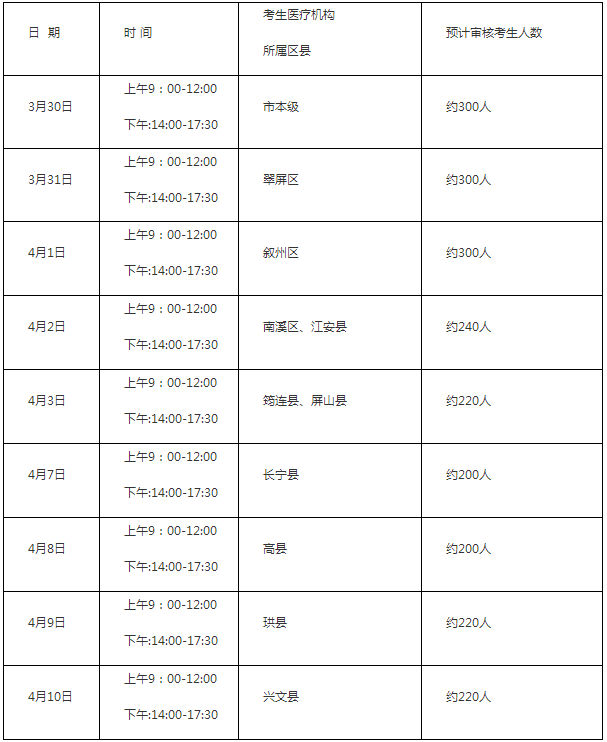 根據(jù)國(guó)家醫(yī)師資格考試相關(guān)工作安排,結(jié)合目前新冠肺炎疫情形勢(shì),經(jīng)研究,宜賓考點(diǎn)2020年醫(yī)師資格考試報(bào)名現(xiàn)場(chǎng)審核工作定于2020年3月30日-4月10日進(jìn)行。為確保做好新冠肺炎防控工作同時(shí),高效有序完成2020年醫(yī)師資格考試報(bào)名現(xiàn)場(chǎng)資格審核工作,有效減少人群聚集,現(xiàn)場(chǎng)審核工作采取分時(shí)段、分縣(區(qū))進(jìn)行,現(xiàn)將有關(guān)事項(xiàng)公告如下: