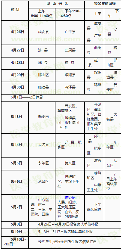(三)各縣(市、區(qū))和市直醫(yī)療單位負(fù)責(zé)醫(yī)考的同志2--3人攜帶考生資料到市醫(yī)考中心(邯鄲市曙光街2號(hào))進(jìn)行現(xiàn)場(chǎng)審核,考生不需到審核現(xiàn)場(chǎng)。