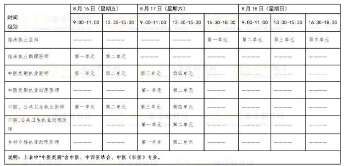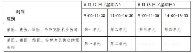 考試實行計算機化考試。軍隊現(xiàn)役人員加試軍事醫(yī)學、院前急救崗位和兒科專業(yè)加試相應內容。中醫(yī)類別藏醫(yī)專業(yè)實行紙筆考試。統(tǒng)一考試時間如下: