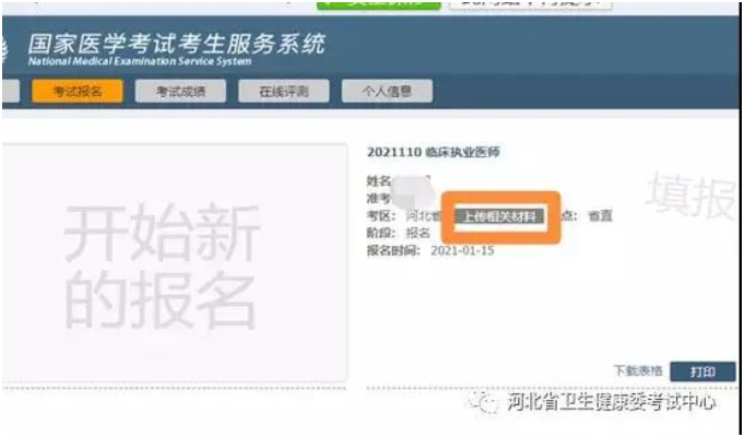 關注考務人員反饋信息:考生按常規(guī)報名流程進入國家醫(yī)學考試考生系統(tǒng),查看自己的報名信息,在報名信息處,點擊“上傳相關材料”按鈕,按頁面提示進入報名材料上傳界面。