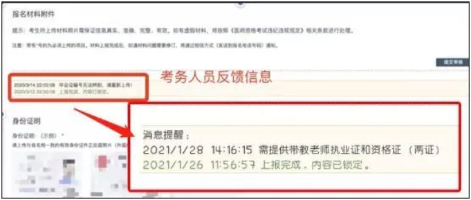 在資格審核期間,若考生收到審核短信、國家醫(yī)學考試中心公眾號信息反饋,或登錄報名網站訪問文件上傳頁面,在頁面上部可查看反饋意見,應根據反饋內容,對解鎖的材料進行調整并重新完成上傳。