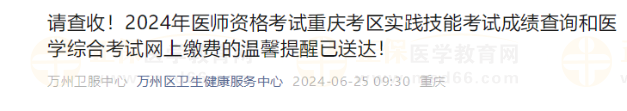 請查收!2024年醫(yī)師資格考試重慶考區(qū)實踐技能考試成績查詢和醫(yī)學綜合考試網(wǎng)上繳費的溫馨提醒已送達!
