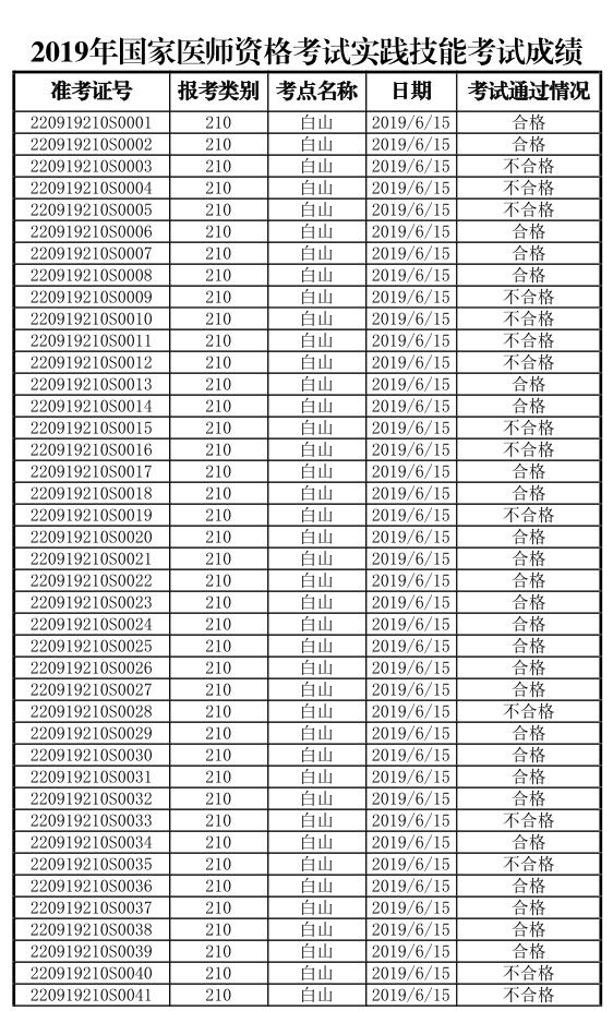吉林白山市2019年國家醫(yī)師資格考試實(shí)踐技能6月16日參加考試的考生成績名單已經(jīng)公布,主要是臨床執(zhí)業(yè)醫(yī)師(110)、臨床助理醫(yī)師(210)和鄉(xiāng)村全科助理醫(yī)師(216)合格與不合格的名單,具體情況請到官方網(wǎng)站自行查詢!