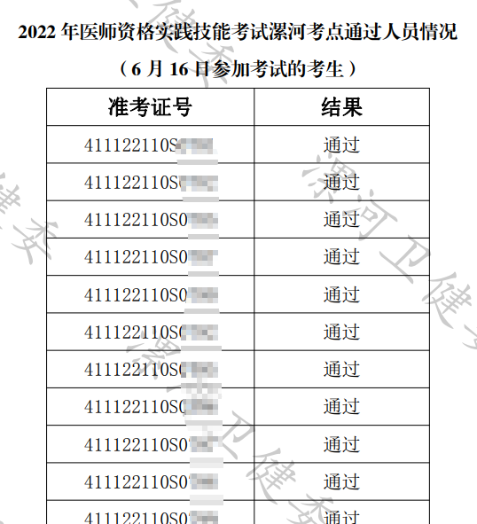 2022年醫(yī)師資格實(shí)踐技能考試漯河考點(diǎn)通過(guò)人員情況(6月16日參加考試的考生):