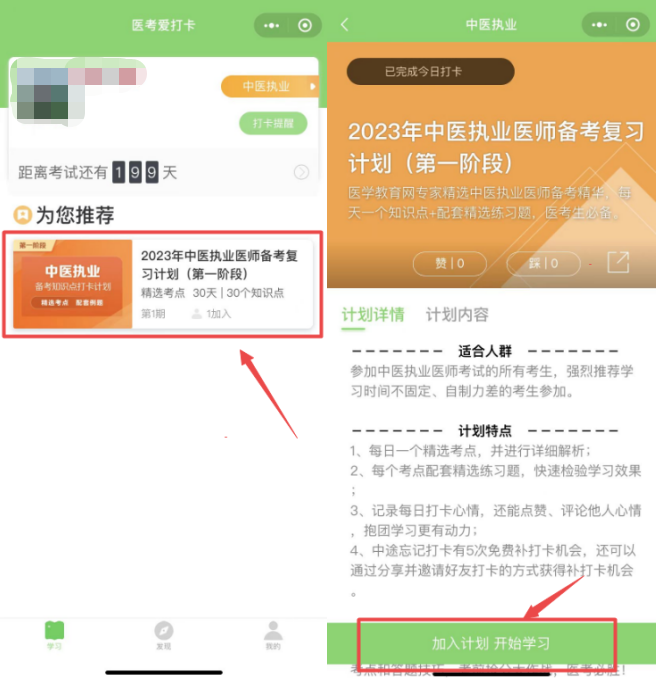 請選擇“您的備考計劃”,如中醫(yī)執(zhí)業(yè)醫(yī)師備考復(fù)習計劃(第一階段),然后點擊下方“加入計劃開始學習”按鈕,開始正式進入打卡學習;