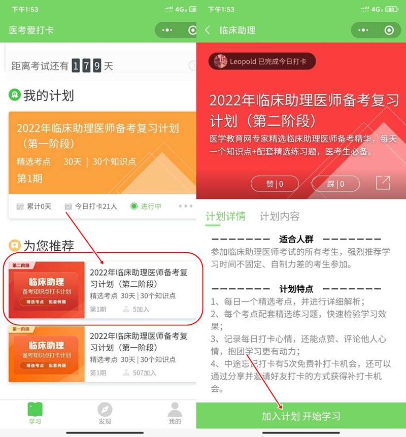 第三步:選擇備考科目后即進(jìn)入學(xué)習(xí)計(jì)劃選擇的頁(yè)面,請(qǐng)選擇“您的備考計(jì)劃”,如臨床助理醫(yī)師備考復(fù)習(xí)計(jì)劃(第二階段),然后點(diǎn)擊下方“加入計(jì)劃開(kāi)始學(xué)習(xí)”按鈕,開(kāi)始正式進(jìn)入打卡學(xué)習(xí);