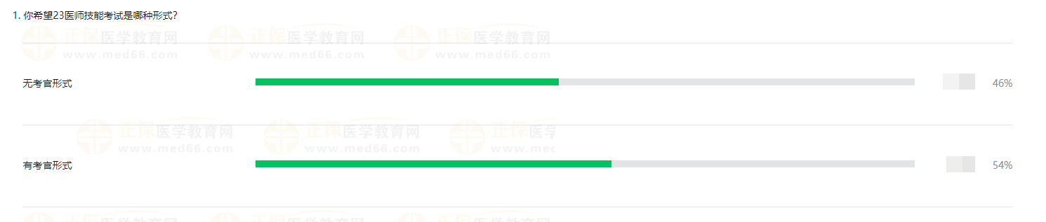 關(guān)于“你希望2023醫(yī)師技能考試是哪種形式?”的問題,醫(yī)學(xué)教育網(wǎng)進行了投票,投票結(jié)果已出,有54%的考生選擇了有考官形式,看來大多數(shù)的考生還是比較適應(yīng)有考官在場的考生。再次也要提醒各位考生如果所在考點是無考官模式一定要多多演練,提前適應(yīng)!