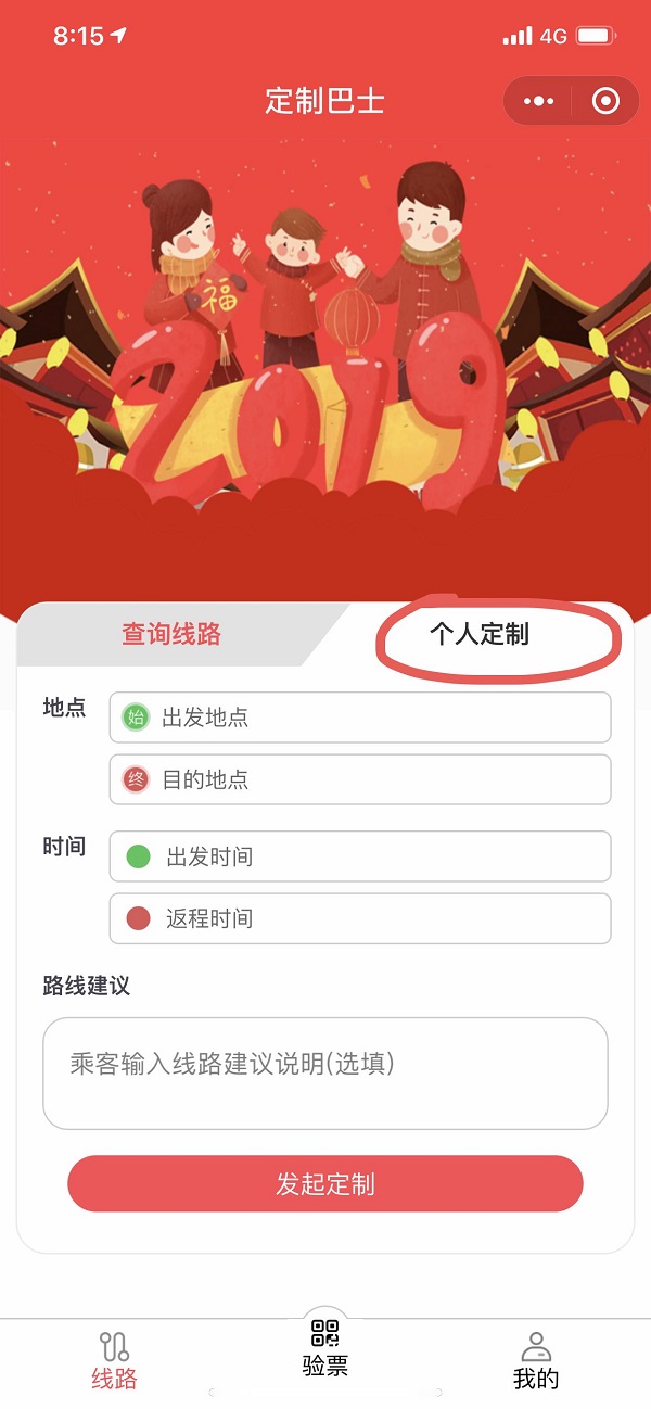 ③選擇個人定制,根據(jù)自己出發(fā)地點(diǎn)、目的地、時間進(jìn)行填寫