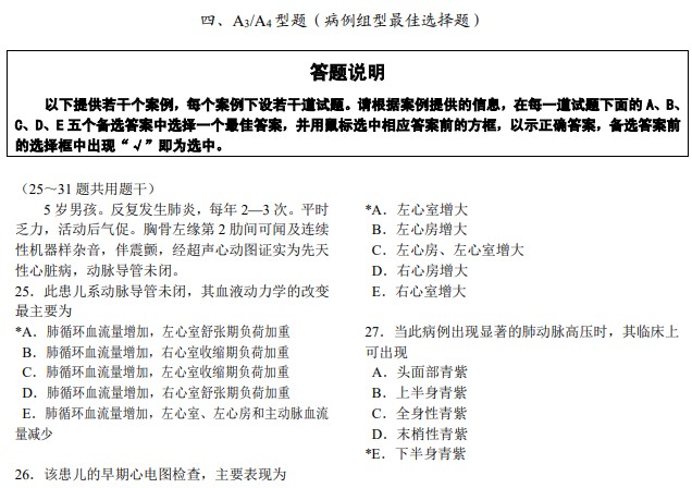 醫(yī)師資格考試采用 A 型和 B 型題,共有 A1、A2、A3、A4、B1 五種題型。醫(yī)師資格考試總題量為 600題,助理醫(yī)師資格考試總題量為 300 題?,F將各種題型簡要介紹如下: