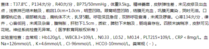 ①重度脫水表現(xiàn):少尿至無尿,皮膚彈性差,前囟和眼窩明顯凹陷,哭時無淚,四肢末端涼,皮膚可見花斑。(0.5分)