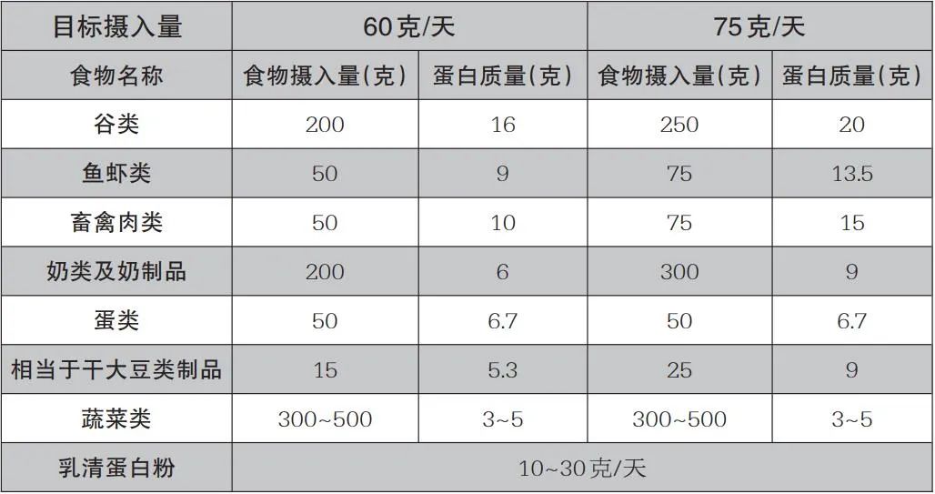 一位老年人每日要攝入1.2~1.5克/千克蛋白質(zhì)。以一位50千克體重的老年人為例,其蛋白質(zhì)目標攝入量為60克/天~75克/天。我們?yōu)槟峁┝艘环輩⒖际匙V,詳見以下圖表。