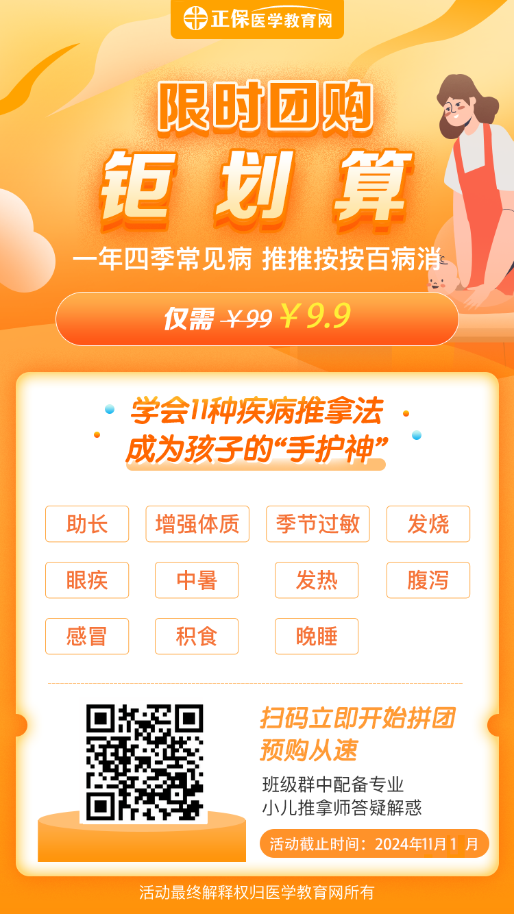跟大家一起分享超實用的小兒推拿全攻略!一招搞定寶寶季節(jié)性疾??!現(xiàn)在購買課程可享受超值活動!三人拼團(tuán)僅需9.9元!