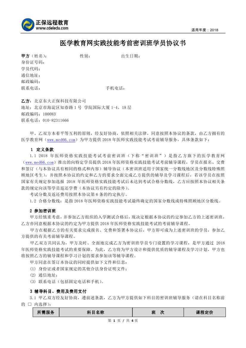 2018年北京醫(yī)學(xué)教育網(wǎng)實(shí)踐技能考前密訓(xùn)班學(xué)員協(xié)議書