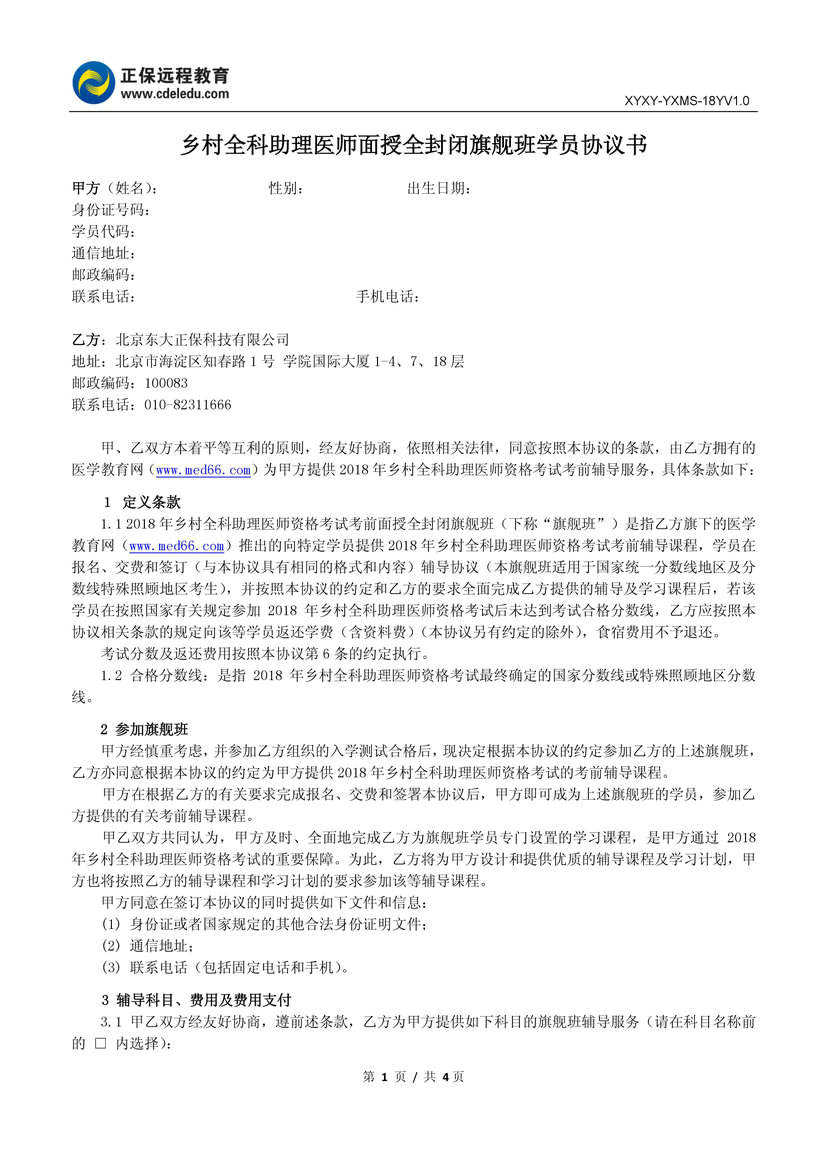 2018年鄉(xiāng)村全科執(zhí)業(yè)助理醫(yī)師面授全封閉旗艦班學(xué)員協(xié)議書