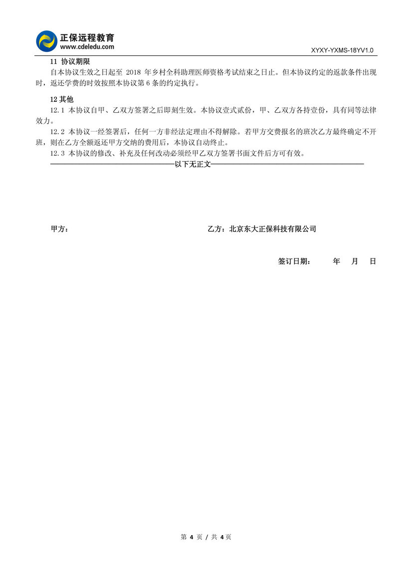 2018年鄉(xiāng)村全科執(zhí)業(yè)助理醫(yī)師面授全封閉旗艦班學(xué)員協(xié)議書