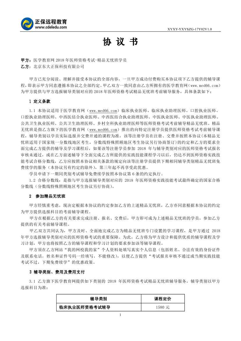 2018年醫(yī)師資格“精品無憂班”協(xié)議書