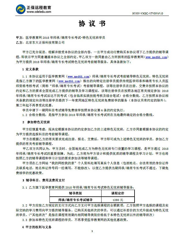 2018年中醫(yī)師承/確有專長考試“特色無憂班”協(xié)議書