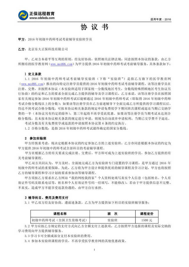 初級(jí)中藥師考試“實(shí)驗(yàn)班”協(xié)議書(shū)