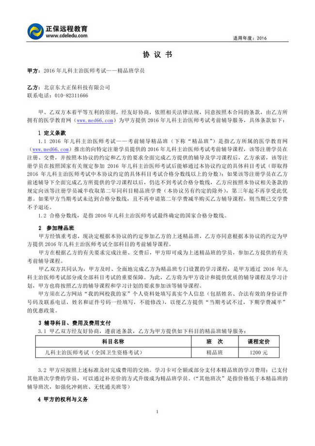 兒科主治醫(yī)師考試“精品班”協(xié)議書