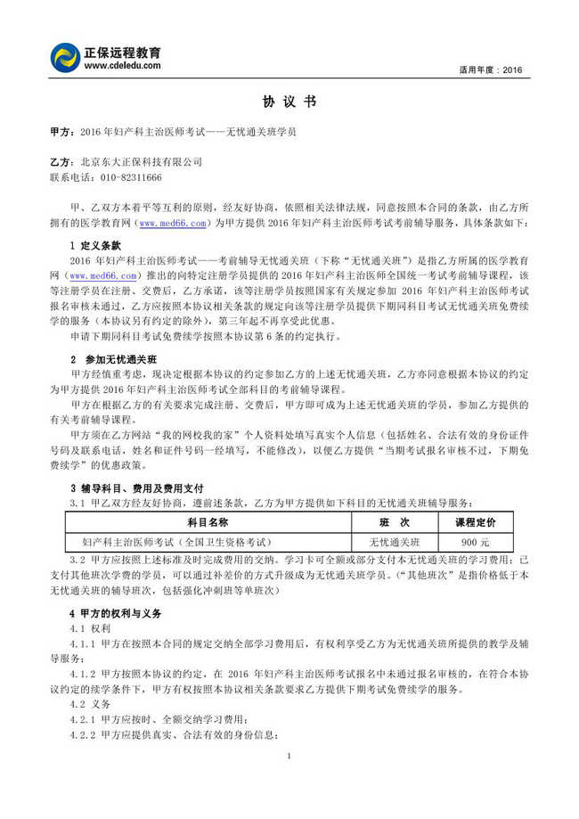 婦產(chǎn)科主治醫(yī)師考試“無憂通關(guān)班”協(xié)議書