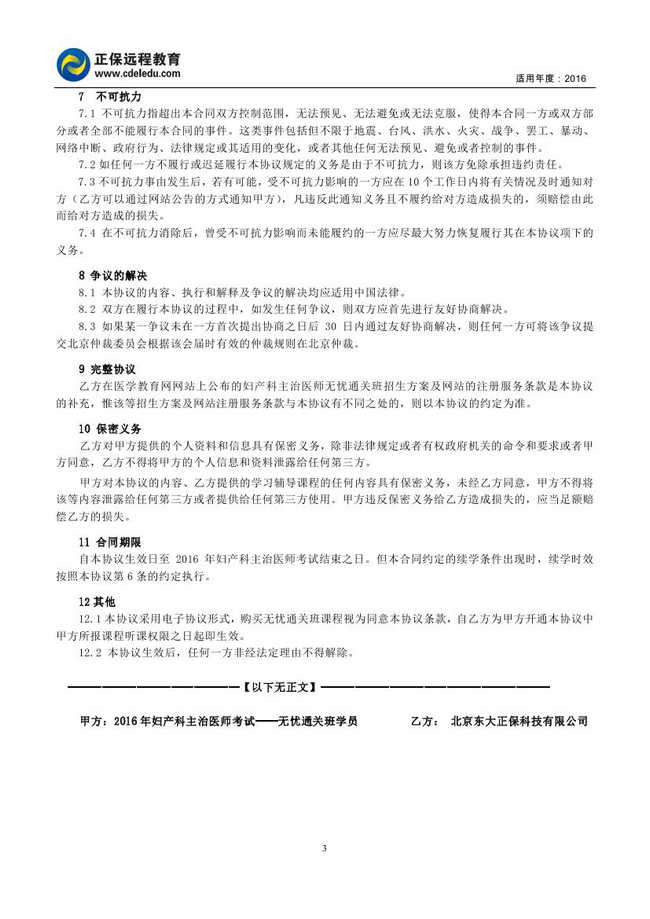 婦產(chǎn)科主治醫(yī)師考試“無憂通關(guān)班”協(xié)議書