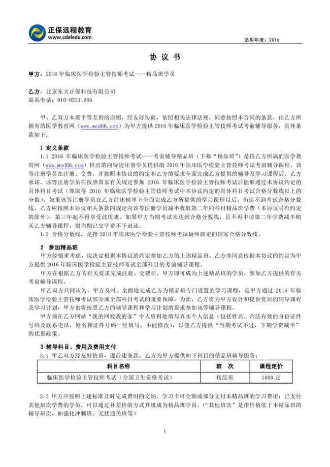 臨床醫(yī)學(xué)檢驗(yàn)主管技師考試“精品班”協(xié)議書