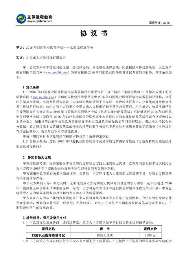 口腔執(zhí)業(yè)醫(yī)師“實驗無憂班”協(xié)議書